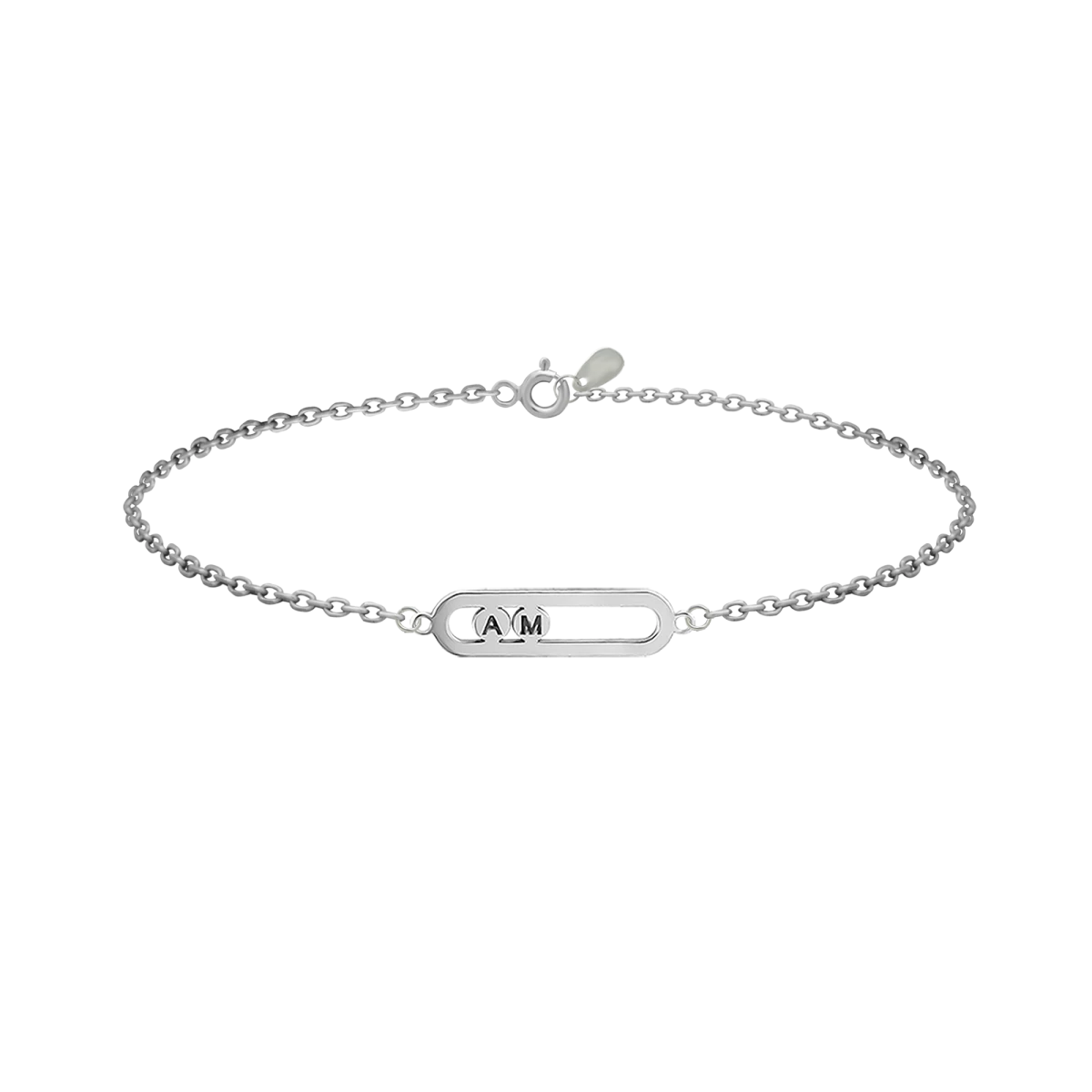 Pandantiv în formă de ac de siguranță cu 2 cercuri pentru bărbați. Două caractere personalizate pot fi gravate pe cercurile din interiorul pandantivului. Face bijuteria cu adevărat unică, de exemplu cu monograma ta!