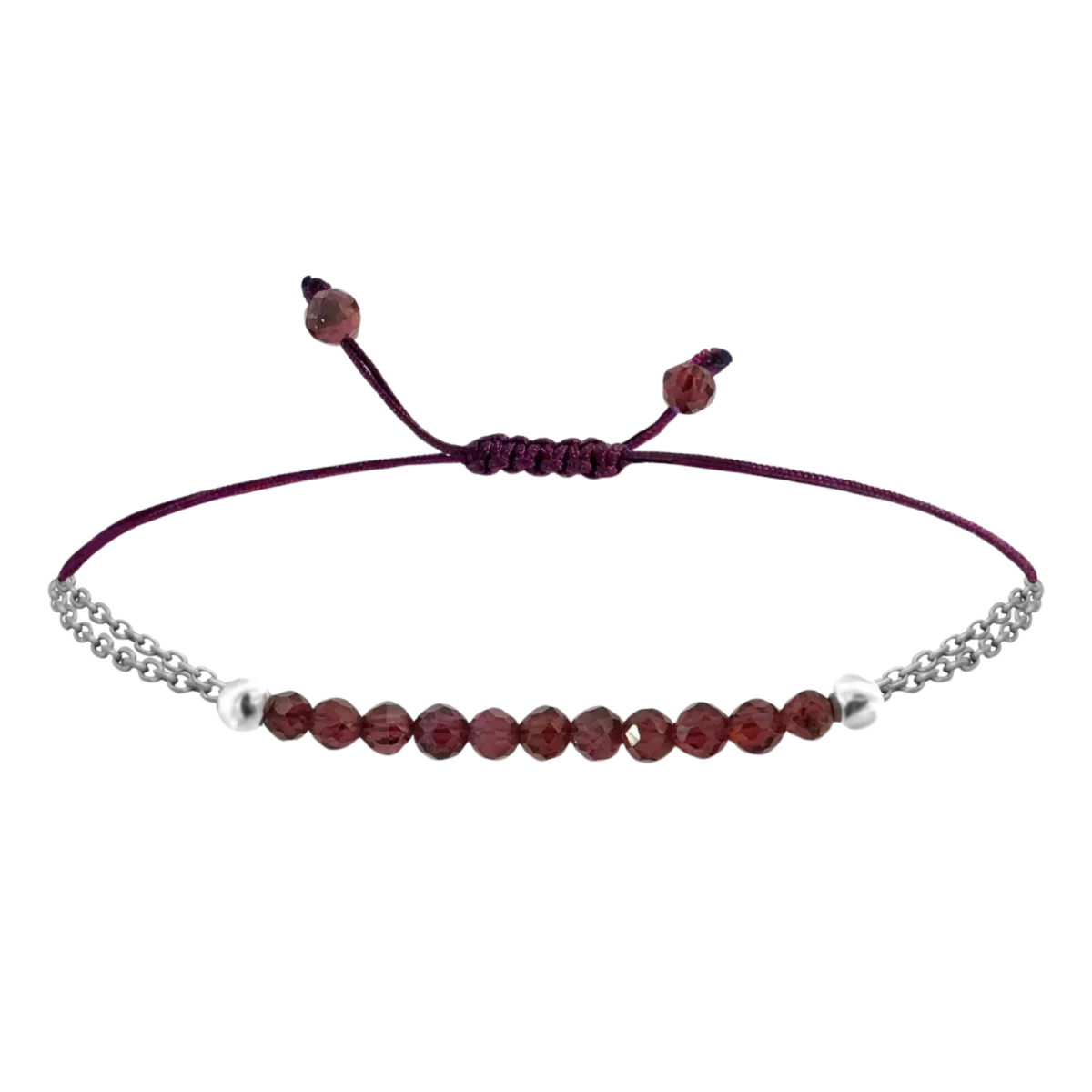 Brățară realizată cu granat mineral, o bilă din argint fin 925, fir colorat rezistent la rupere și tehnică macrame. Granatul este piatra ajutorului. Regenerează corpul, purifică sângele, umple întregul organism cu energie vitală și susține dezvoltarea personală. Oferă purtătoarei încredere în sine și voință, fiind o piatră conectată la chakra rădăcinii și la energia vitală.