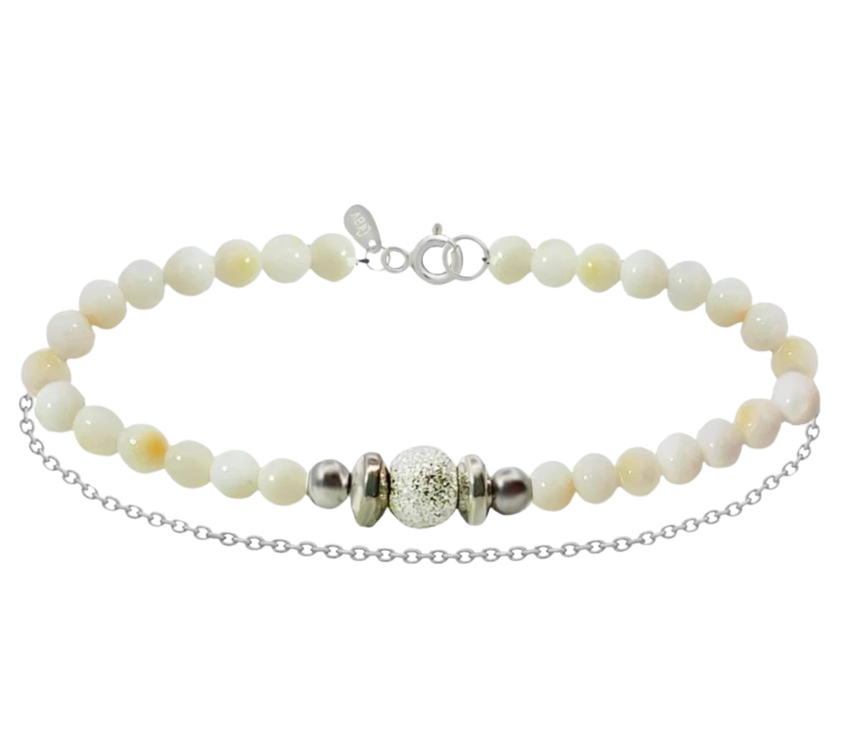 Bucură te zilnic de frumusețea naturii cu această brățară handmade din sidef, ale cărei detalii fine ale lanțului din argint și elementele suplimentare din argint îmbină eleganța curată cu designul modern. Diametrul mărgelelor din sidef: 3 mm.