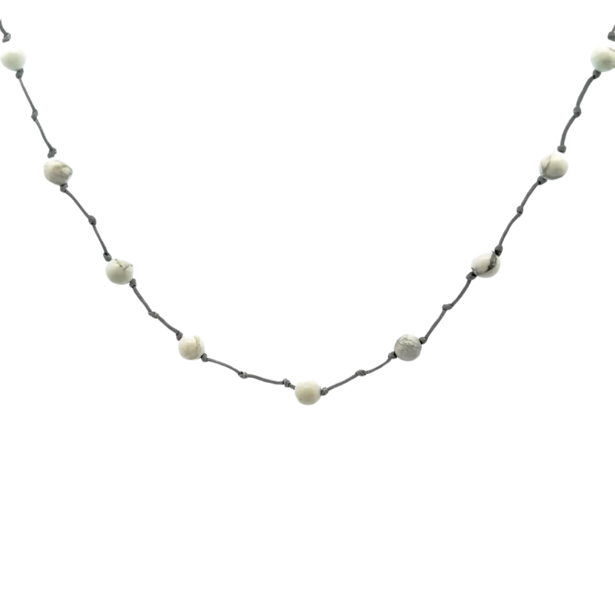 Colier înșirat pe șnur colorat rezistent la rupere, realizat prin înnodare manuală, cu mărgele din howlit și o închizătoare din argint 925. Culoarea șnurului poate fi schimbată la cerere. Vă rugăm să specificați culoarea aleasă într o notă.