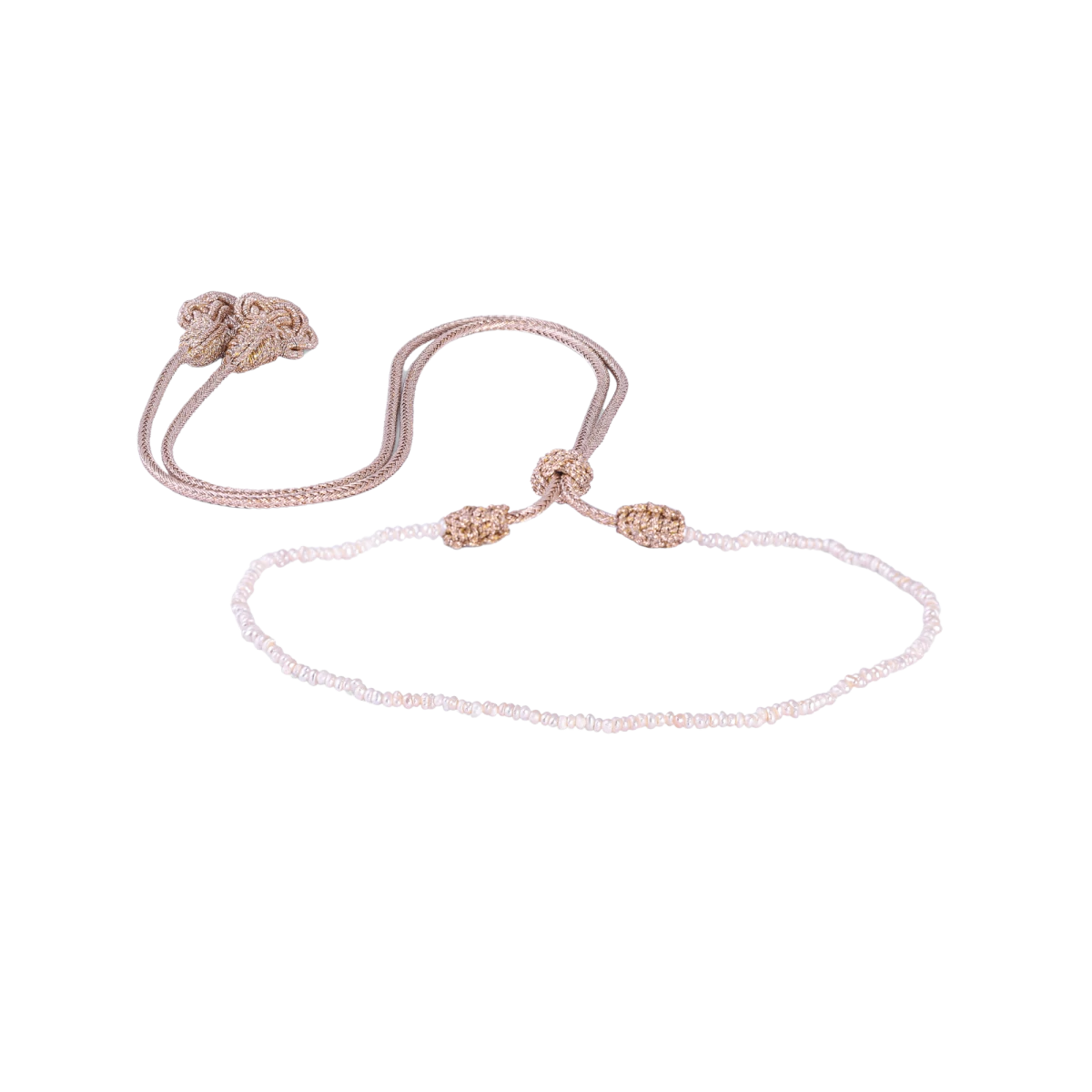 Colier realizat manual, timpul de producție este de peste 5 ore. Materialul se numește „Sfifa” în arabă, realizat prin împletirea firelor tradiționale de aur. Prin designul elegant și utilizarea perlelor, completează perfect bijuteriile. Țesătura este impermeabilă, dar pentru o durată de viață mai lungă nu se poartă la duș, la treburile casnice sau la antrenament. Datorită nodurilor glisante, mărimea colierului poate fi ajustată flexibil.