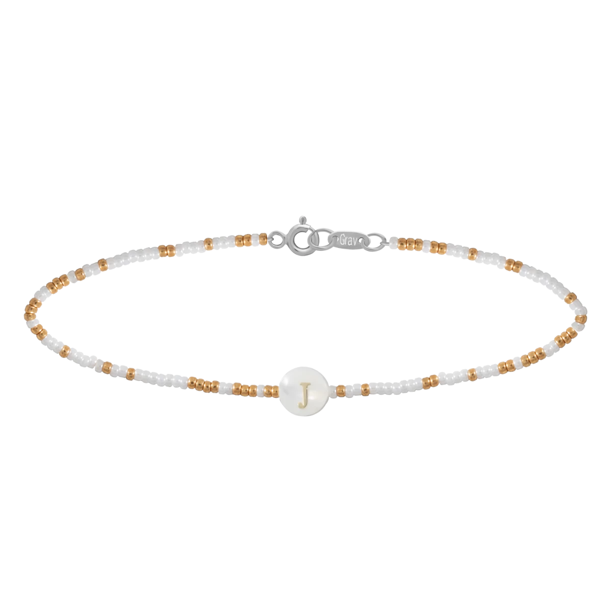Brățară din mărgele japoneze tip seed bead alb și auriu cu pandantiv literă, argint 925